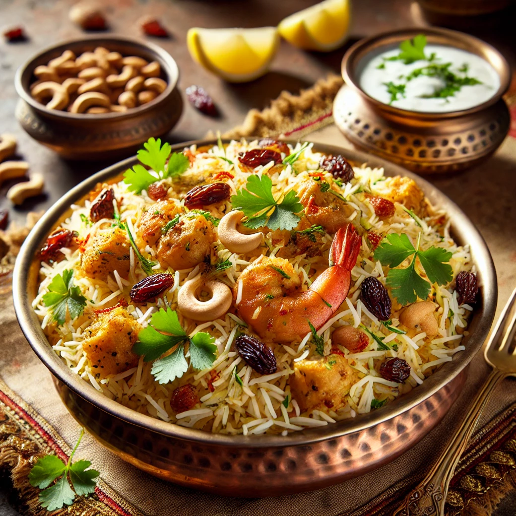 Le Biryani est un plat emblématique de la cuisine indienne, apprécié pour ses arômes intenses et sa richesse en épices. Ce délicieux riz basmati est cuit avec un mélange d’épices, de viande (agneau, poulet ou crevettes), d’oignons et de yaourt, le tout lentement mijoté pour révéler toutes ses saveurs.